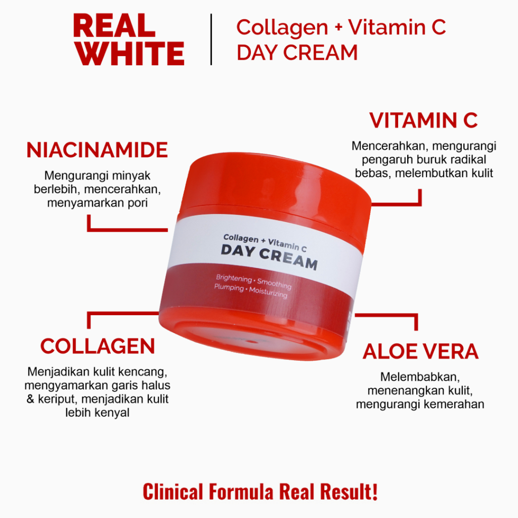 Apakah Anda sedang mencari solusi terbaik? Jangan lewatkan kesempatan untuk memiliki REAL WHITE Collagen + Vitamin C Day Cream | BPOM HALAL Krim Pagi Pemutih Wajah Skincare Whitening Pencerah Memutihkan Mencerahkan Kulit Muka PIE PIH Skin Barrier Menghilangkan Pelicin Flek Noda Bekas Jerawat Apotek Farmasi Klinik Dokter Perawatan Glowing—produk yang akan mengubah cara Anda [describe the benefit]. Ini adalah kesempatan langka yang sayang untuk dilewatkan!
